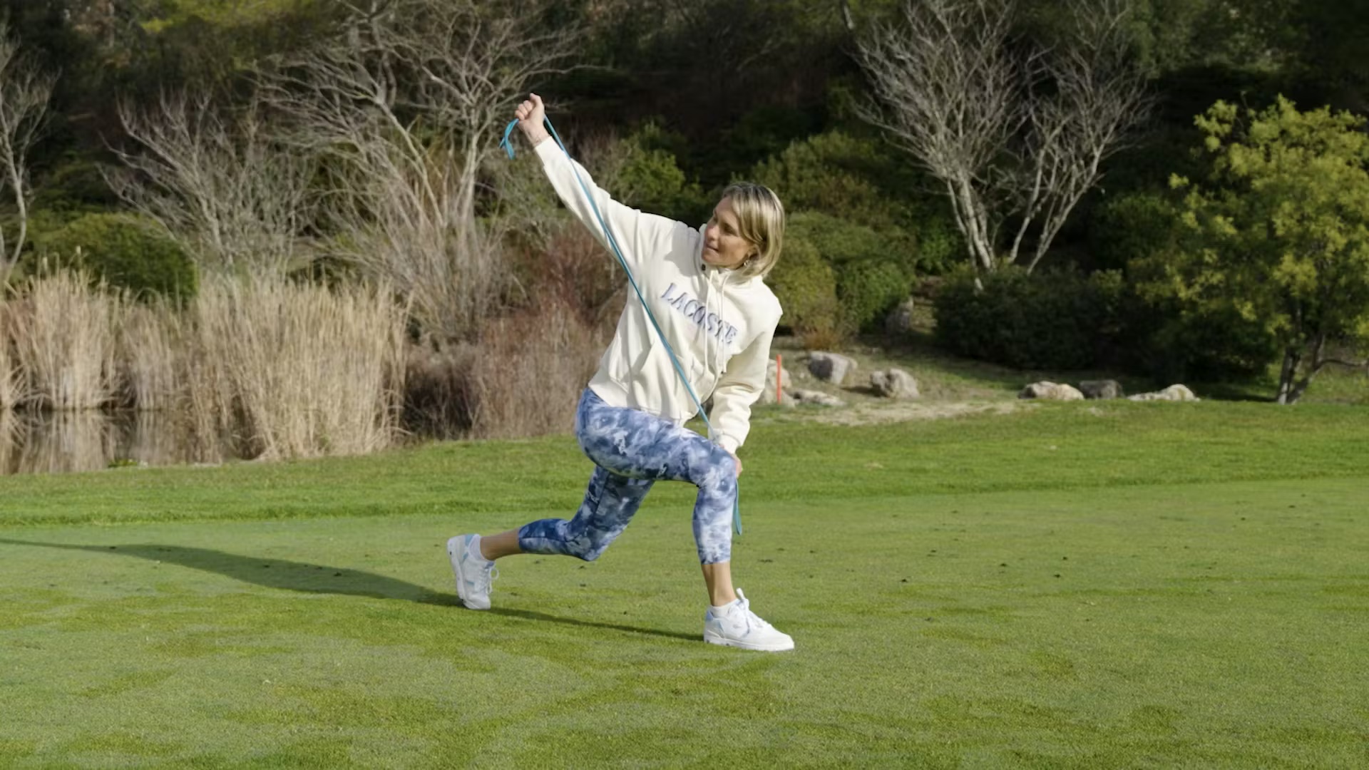 Toujours dans le sac, le petit élastique bleu est un indispensable du golfeur. La première manière de l'utiliser, s'échauffer avec.